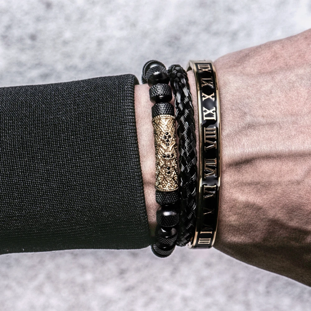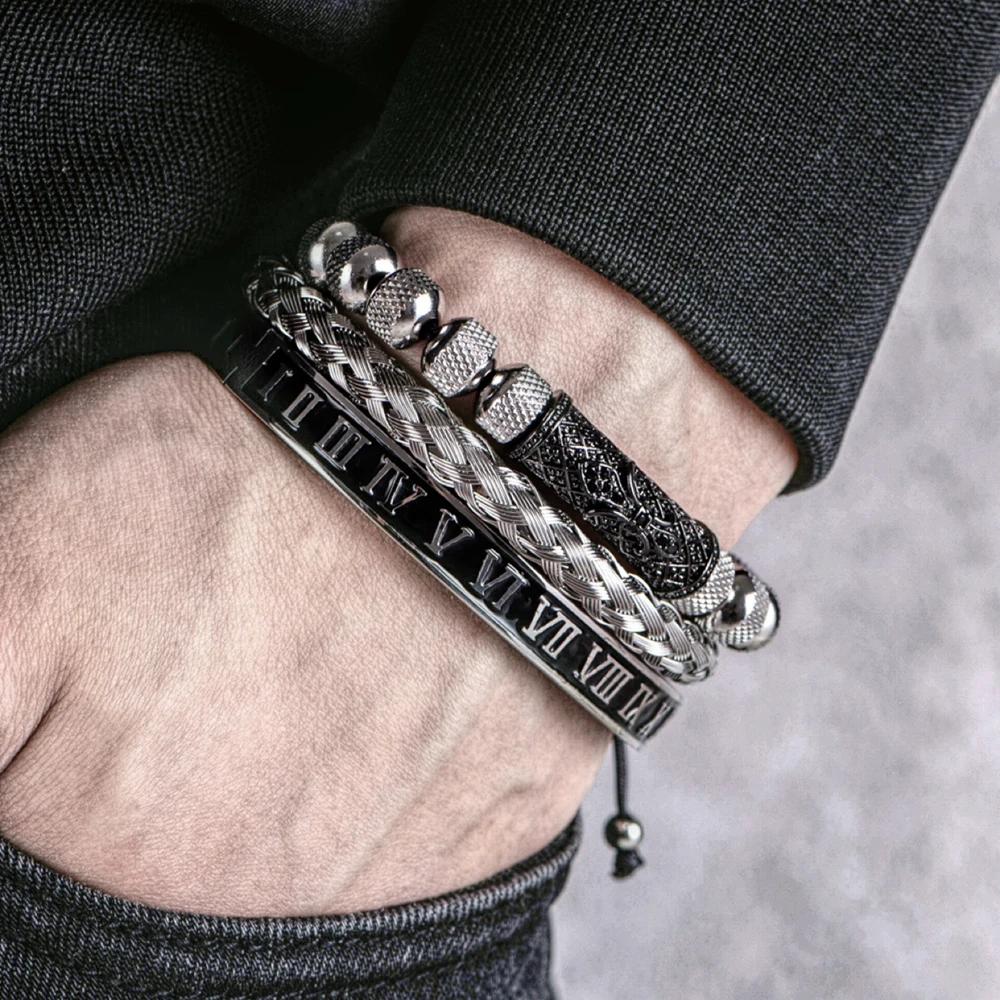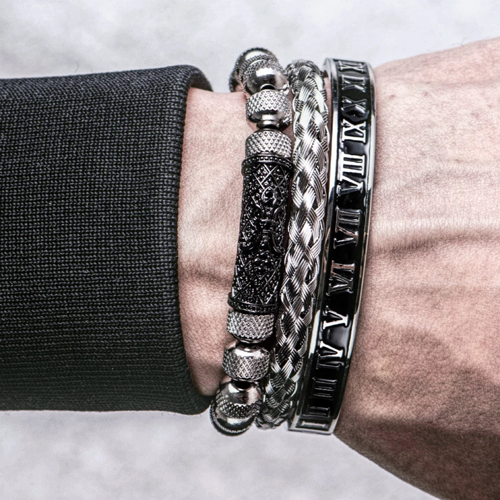 الفاخرة 3 قطع / مجموعة زهرة الصليب سحر الأساور الفولاذ المقاوم للصدأ سوار الرجال المينا رقم روماني أوروبا مجوهرات الموضة